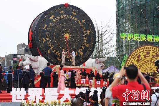 今年6月29日,在广西环江毛南族自治县铸造的直径6.68米铜鼓刷新吉尼斯世界纪录。 俞靖 摄