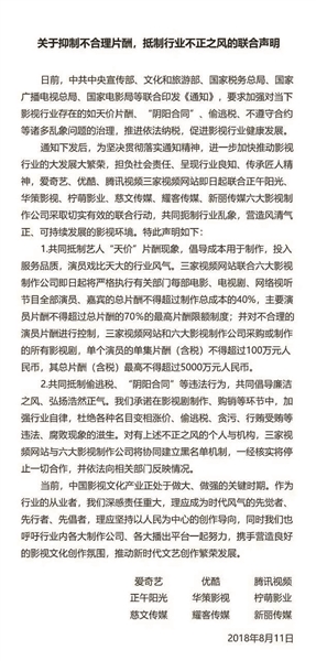 声明称,共同抵制艺人“天价”片酬现象,倡导成本用于制作,投入服务品质,演员戏比天大的行业风气。“即日起执行有关部门每部电影、电视剧、网络视听节目全部演员、嘉宾总片酬不得超过制作成本的40%,主要演员片酬不得超过总片酬的70% 的最高片酬;并对不合理的演员片酬进行控制,三家视频网站和六大影视制作公司采购或制作的所有影视剧,单个演员的单集片酬(含税)不得超过100万人民币,其总片酬(含税)最高不得超过5000万元。”