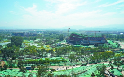 位于北京延庆妫水河畔的北京世园会园区工程建设现场,中国馆、国际馆实现主体结构封顶,植物馆、天田山、永宁阁等核心建筑初绽芳容。