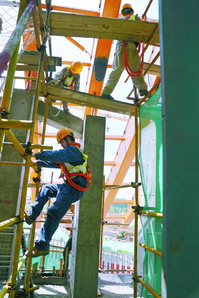 正午时分,中国馆安装班组的师傅们仍然系着安全绳登高作业。