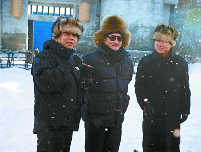 拍《智取威虎山》时, 于冬、徐克、黄建新在片场合影(右起)。