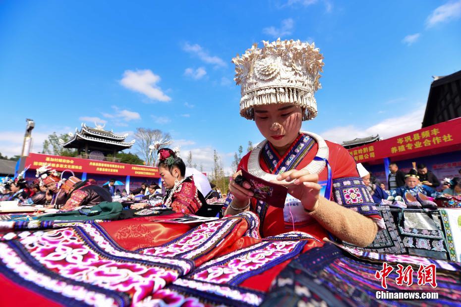 11月9日,贵州省黔东南苗族侗族自治州丹寨县万达小镇举办黔东南苗族侗族自治州能工巧匠手工技艺选拔比赛,民间能工巧匠和非遗传承人们分别参加了手工刺绣、蜡染绘画、银饰打制和手工编织比赛。图为绣娘在参加刺绣比赛。中新社发 杨武魁 摄