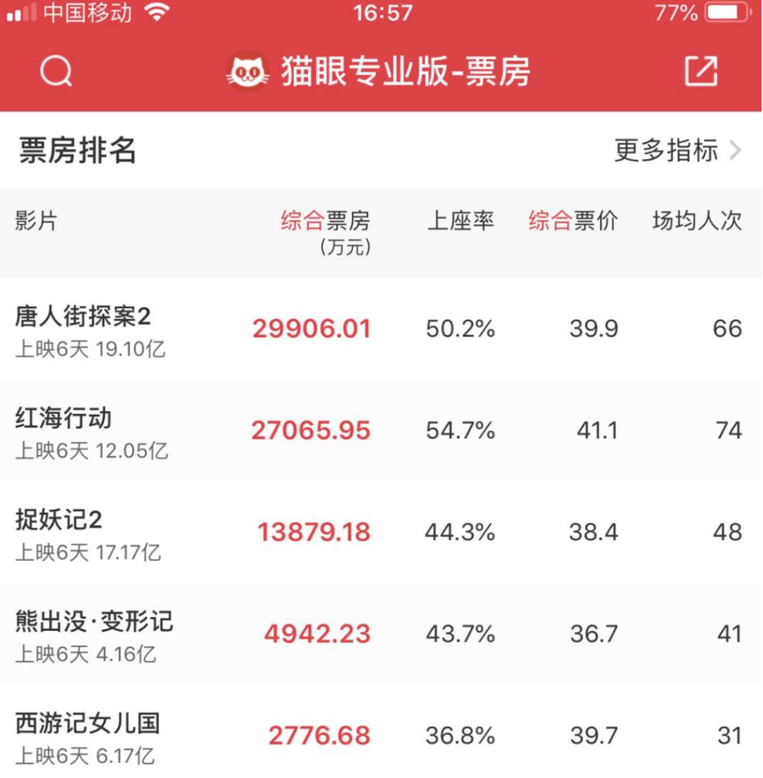 去年春节档电影上映6天后票房情况(数据来源:猫眼专业版)