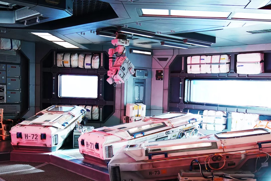 为此,在场景搭建之前,团队还专门使用VR系统模拟出搭建场景,在里面预先进行踩点测试。团队还专门成立了一个在中国电影剧组中从没出现过的视觉部门,进行统一管理调度。《流浪地球》最终道具超过1万件,“没有一件是可以直接买到的”。置景延展面积近10万平方米,相当于14个足球场,包括运载车、地下城、空间站等都是实景搭建。