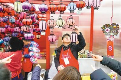 今年2月5日,人们在故宫举行的“中华老字号故宫过大年展”上选购灯笼。