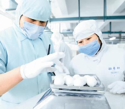 今年2月17日,中华老字号北京稻香村的生产车间一派繁忙,30多台机器摇制元宵,以满足首都节日市场。图为现场管理人员在抽检元宵的分量。