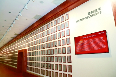 在汉能集团长约50米、高约5米的专利墙上,布满了公司取得的专利证书