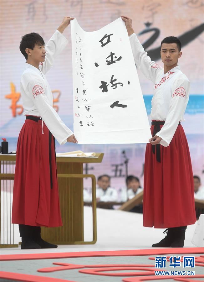 4月10日,第35届兰亭书法节开幕式上展示书法家现场书写的“立德树人”书法作品。 当日,第35届兰亭书法节开幕式在浙江绍兴兰亭景区举行,来自海内外的书法家身着晋服,在曲水边品酒、赋诗、挥毫,再现曲水流觞盛况。 新华社记者 黄宗治 摄