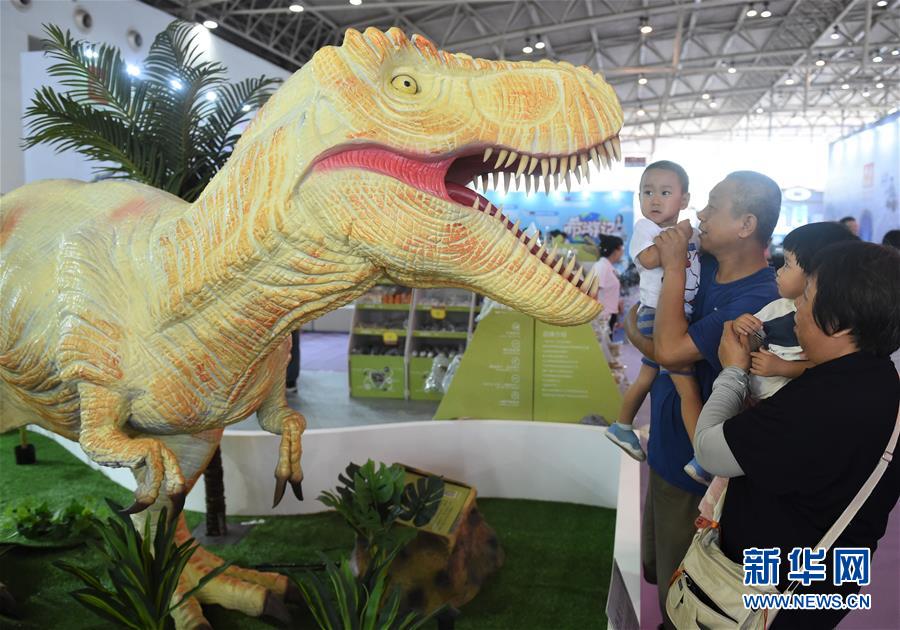 7月11日,在北京玩博会上,几名小朋友在家长的陪伴下与一只“恐龙”互动。 当日,第10届中国玩博会·北京站(简称北京玩博会)在全国农业展览馆开幕,来自国内外210多个玩具品牌的上万款玩具参展,涵盖拼插积木、科技智能、创意DIY等品类。此次玩博会将持续至7月14日。 新华社记者 罗晓光 摄