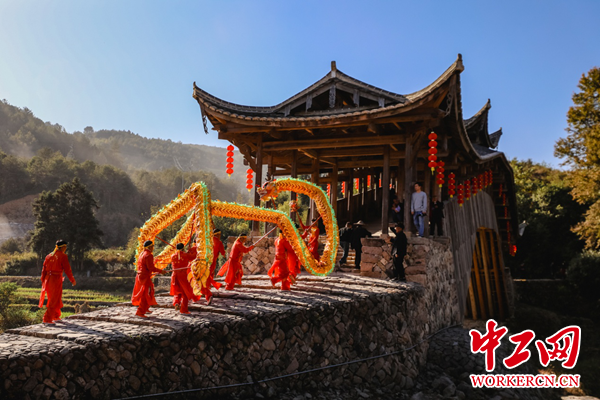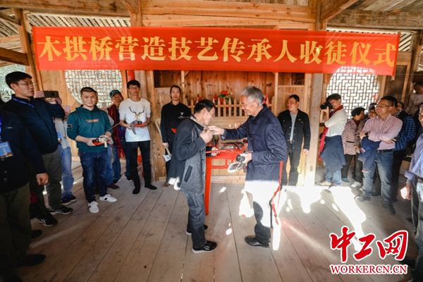 走出展馆,人们在活灵活现的碇步龙表演簇拥下走上文兴桥,参加了木拱桥营造技艺传承人曾家快、赖永斌、郑昌贵收徒仪式,共同见证了木拱廊桥营造技艺的传承和延续。