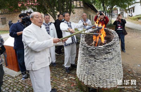 把桩师傅胡家旺(前)参加景德镇葫芦窑复烧点火仪式(10月21日摄)。 新华社记者 周密 摄