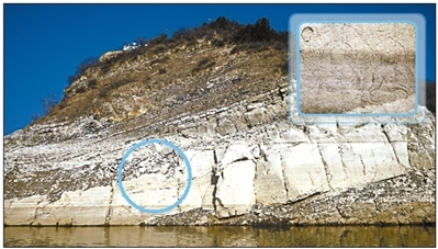 大图画圈处为摩崖造像露出水面部分,小图为保存相对完好的摩崖造像。