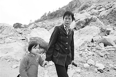 ②一老一少沿着北川废墟中的道路踽踽前行。(2009年)贺少成 摄