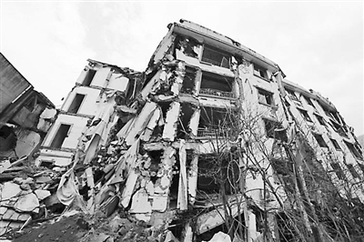 北川县委大院全部坍塌,原先的7层高楼完全看不出高度。更多的建筑外墙被拦腰折断,惊心动魄地高高耸立。