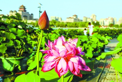 昨天,莲花池公园西门内数百盆盆栽荷花随着高温的催生,许多已是含苞待放,性急的已绽开花蕾,吸引了人们的目光。