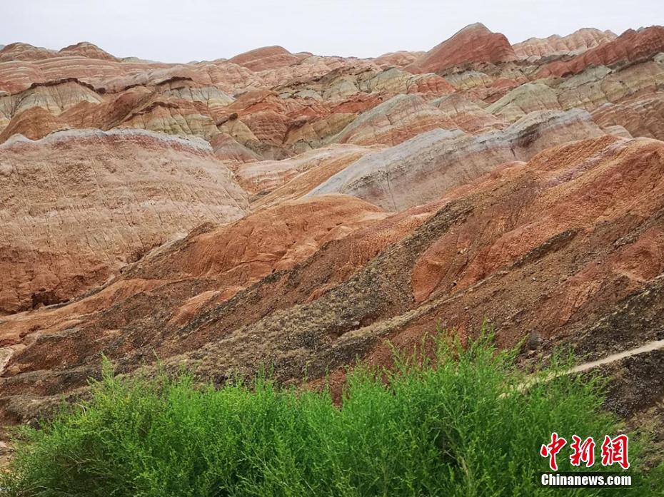夏日的甘肃张掖七彩丹霞在绿色植物点缀下,景观更为迷人,七彩山峦似乎神笔勾画,巧夺天工。