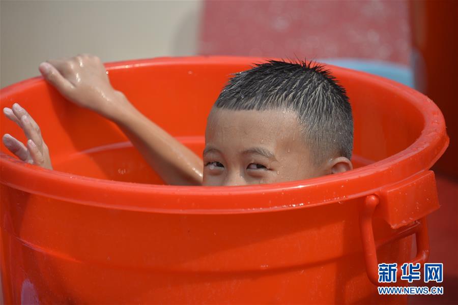 7月7日,在山东省聊城市姜堤乐园,小朋友参加泼水节活动。当日是农历小暑节气,人们通过各种方式纳凉消暑,享受夏日乐趣。