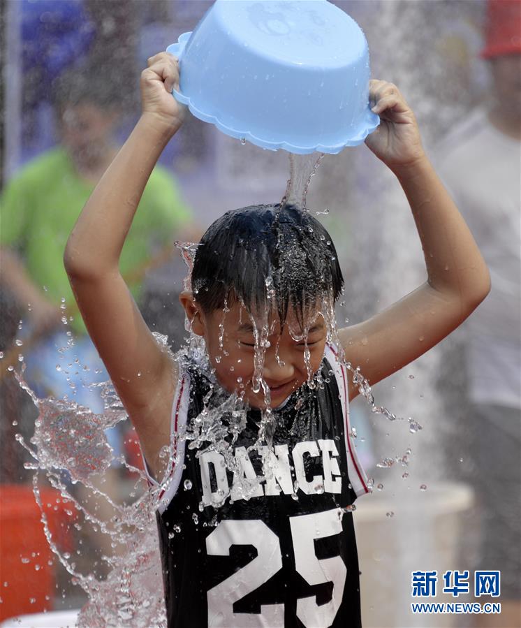 7月7日,在山东省聊城市姜堤乐园,小朋友参加泼水节活动。当日是农历小暑节气,人们通过各种方式纳凉消暑,享受夏日乐趣。