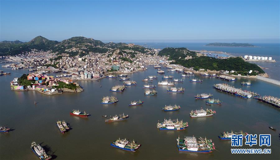 7月9日,在浙江台州温岭市箬山渔港,众多渔船停泊避风(无人机拍摄)。
