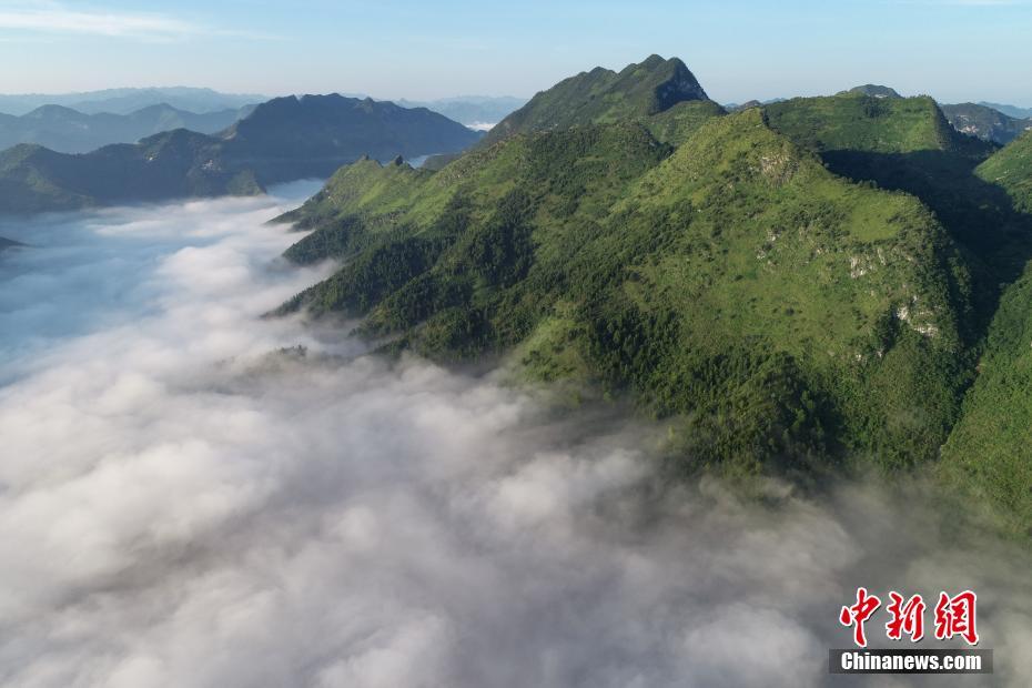 7月18日,无人机航拍贵州省紫云县坝弄布依寨外晨雾。清晨,大雾环绕贵州布依族寨外群山,如梦似幻。中新社记者 贺俊怡 摄
