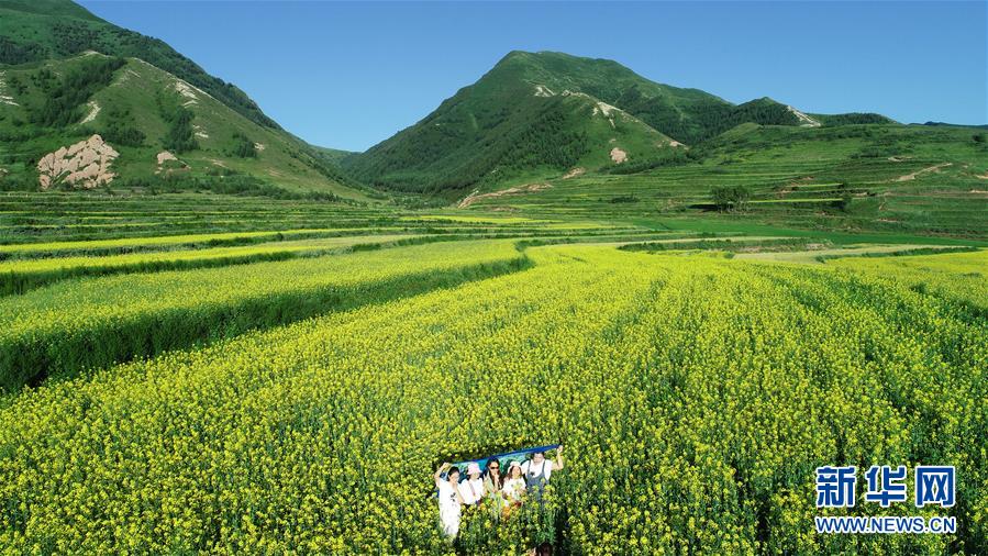 游客在宁夏固原市隆德县观庄乡前庄村设立的油菜花拍照点拍照游玩(7月17日无人机拍摄)。新华社记者王鹏摄