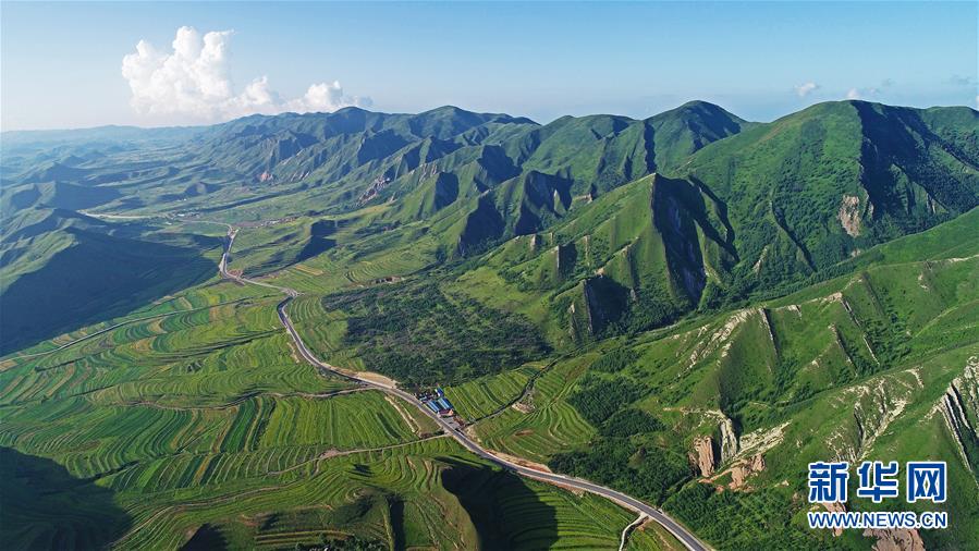 宁夏固原市隆德县观庄乡前庄村盛开的油菜花与苍翠峭拔的六盘山相映成辉(7月17日无人机拍摄)。 新华社记者王鹏摄