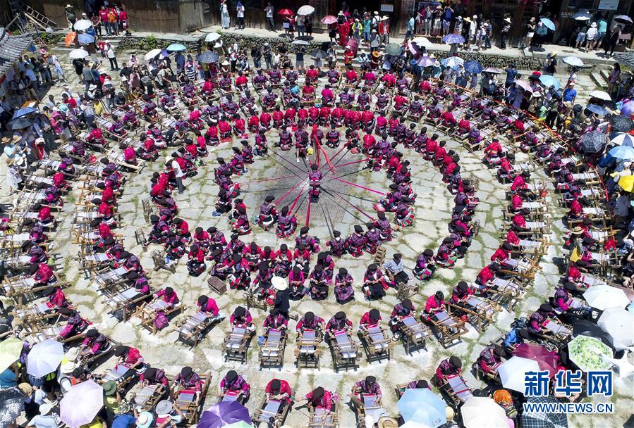 7月18日,在广西龙胜各族自治县龙脊镇大寨村,瑶族妇女在展示传统服饰制作工艺(无人机航拍)。 当日是农历六月初六,广西龙胜各族自治县龙脊镇大寨村举办一年一度的晒衣节。多姿多彩的特色活动吸引众多中外游客前来领略当地民族风情。 新华社发(潘志祥 摄)