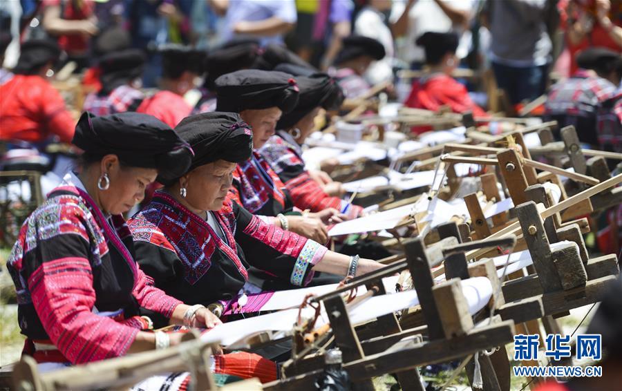 7月18日,在广西龙胜各族自治县龙脊镇大寨村,瑶族妇女在展示传统服饰制作工艺。 当日是农历六月初六,广西龙胜各族自治县龙脊镇大寨村举办一年一度的晒衣节。多姿多彩的特色活动吸引众多中外游客前来领略当地民族风情。 新华社发(潘志祥 摄)