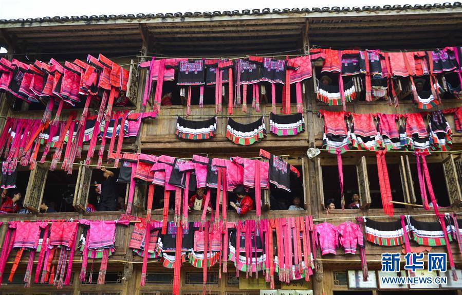 7月18日,在广西龙胜各族自治县龙脊镇大寨村,瑶族妇女在吊脚楼上晾晒花衣花裙。 当日是农历六月初六,广西龙胜各族自治县龙脊镇大寨村举办一年一度的晒衣节。多姿多彩的特色活动吸引众多中外游客前来领略当地民族风情。 新华社发(潘志祥 摄)