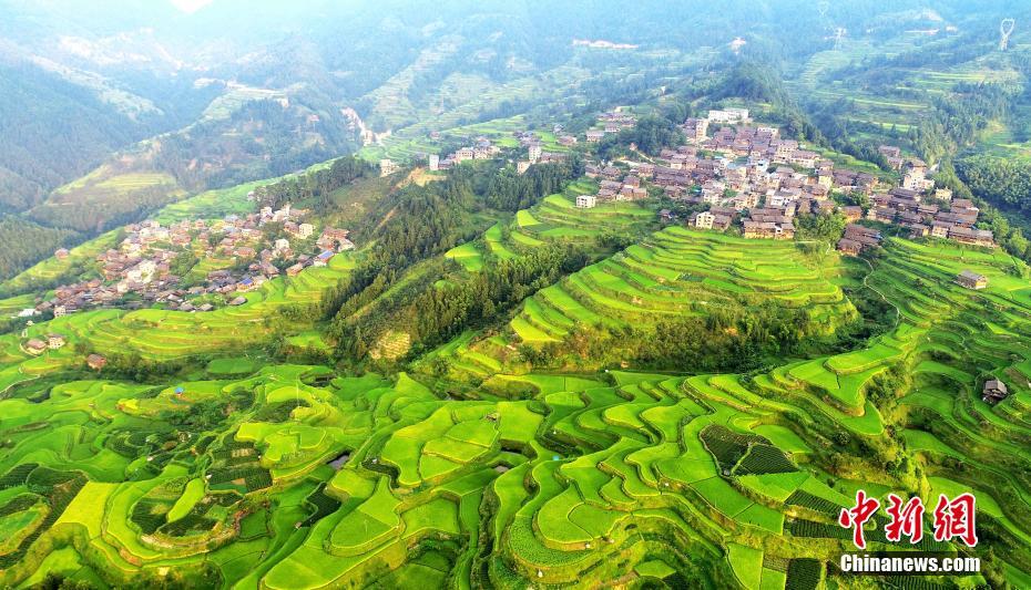 8月26日,秋日的广西柳州市三江侗族自治县稻田渐次成熟,金色梯田错落有致、层层叠叠,与侗族民居交相辉映,静谧如画。图为广西柳州市三江侗族自治县独峒镇唐朝村梯田。
