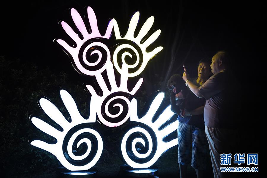 9月18日,人们在一件灯光艺术作品旁查看手机拍摄的画面。当日,第四届杭州灯光小品秀在浙江杭州拱墅区运河天地举行,绚丽多彩的灯光艺术作品吸引了众多观众。 新华社发(李忠 摄)