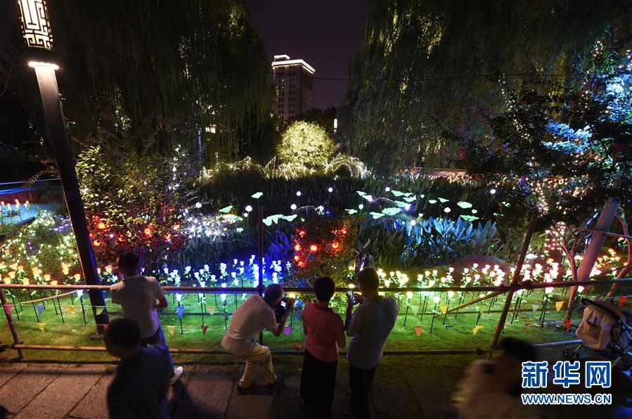 9月18日,人们在第四届杭州灯光小品秀上赏景拍照。当日,第四届杭州灯光小品秀在浙江杭州拱墅区运河天地举行,绚丽多彩的灯光艺术作品吸引了众多观众。 新华社发(李忠 摄)