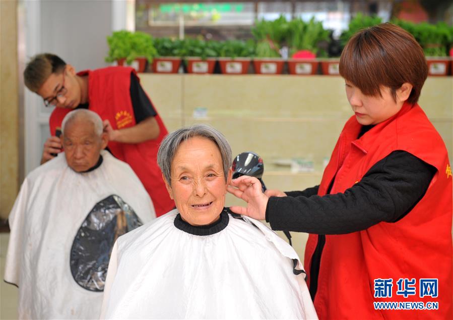 10月17日,河北省肃宁县援老志愿者协会志愿者在志愿服务活动上为老人理发。肃宁县援老志愿者协会组织开展“敬老爱老 爱在重阳”志愿服务活动,为40多位孤寡老人免费体检、理发,陪伴老人欢度重阳。 当日是农历九月初九,是我国传统节日重阳节。全国多地开展了形式多样的敬老活动。 新华社记者 朱旭东 摄