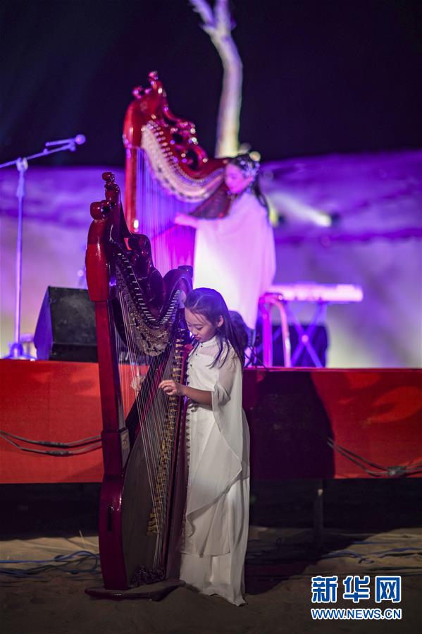 10月20日晚,演员在“沙漠箜篌星空音乐会”上表演节目。 当晚,“沙漠箜篌星空音乐会”在位于新疆塔里木盆地边缘的巴音郭楞蒙古自治州且末县举行。