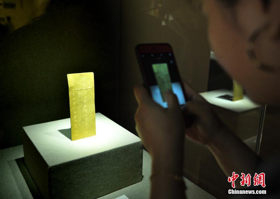 10月21日,《江口沉银——四川彭山江口古战场遗址考古成果展》在四川博物院开展,展出文物521件,主要以金银器为主,吸引大批民众参观。图为出水的金册吸引参观者。中新社记者 刘忠俊 摄
