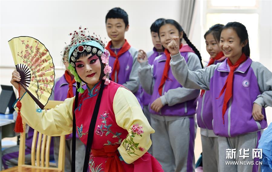 11月15日,在石家庄市桥西区中华南大街小学,戏曲演员向小学生展示戏曲动作。 当日,河北省石家庄市桥西区主办的“戏曲进校园”活动走进中华南大街小学,通过专业戏曲演员的传统曲目展演、交流互动、戏曲知识讲解等内容,使学生“乐在戏中”,零距离感受传统戏曲的魅力。 新华社发(张晓峰 摄)