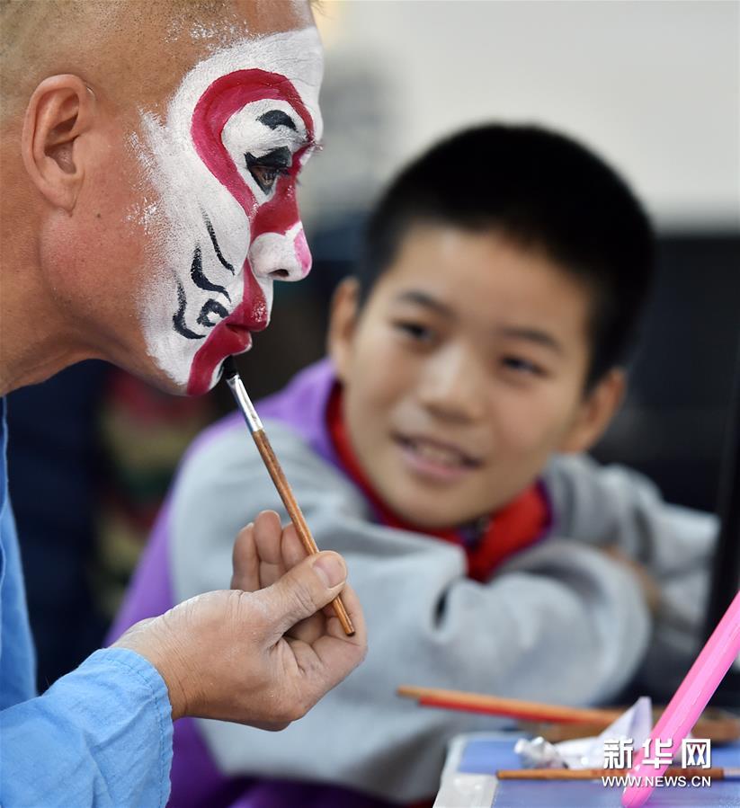 11月15日,在石家庄市桥西区中华南大街小学,戏曲演员准备表演。 当日,河北省石家庄市桥西区主办的“戏曲进校园”活动走进中华南大街小学,通过专业戏曲演员的传统曲目展演、交流互动、戏曲知识讲解等内容,使学生“乐在戏中”,零距离感受传统戏曲的魅力。 新华社发(张晓峰 摄)
