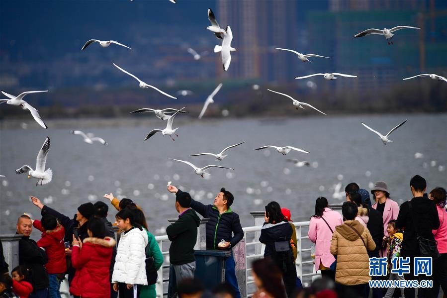新年第一天,市民与游客来到云南昆明的海埂大坝、大观公园等地,与前来越冬的红嘴鸥嬉戏,欢庆新年。