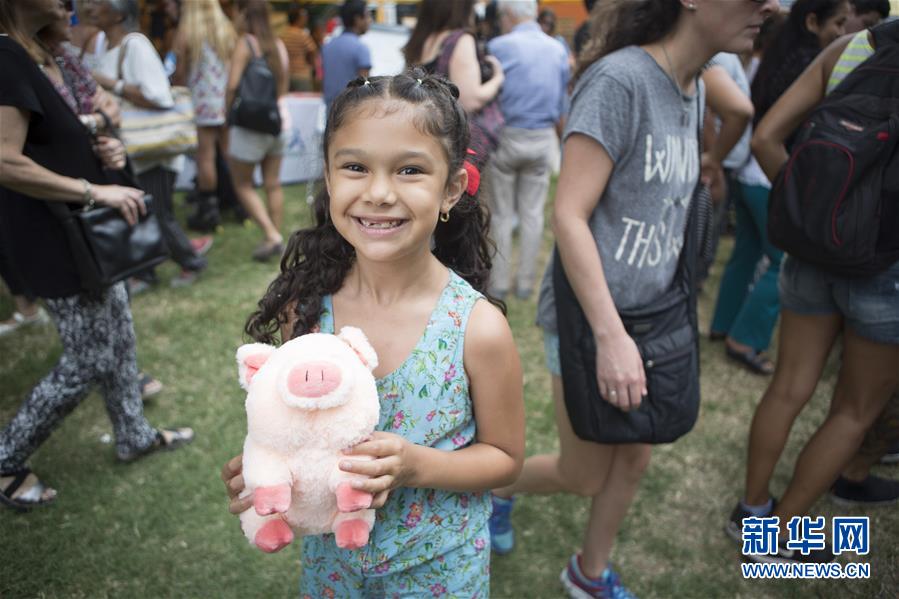 2月2日,在阿根廷布宜诺斯艾利斯举行的“欢乐春节 魅力阿根廷”猪年春节庙会现场,一名当地女孩抱着小猪玩偶。