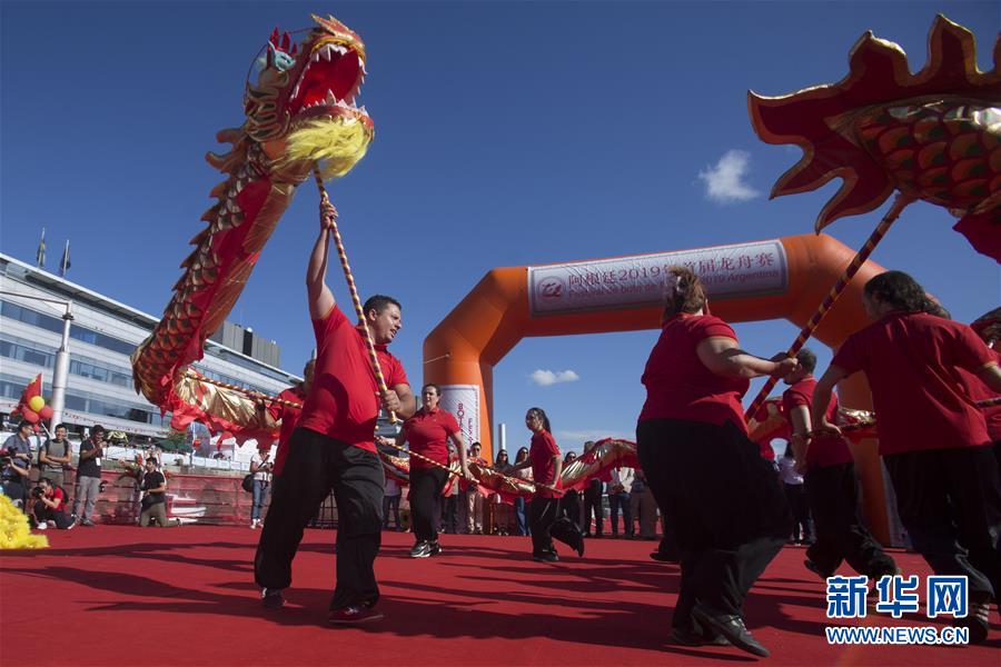 2月3日,在阿根廷布宜诺斯艾利斯,演员在龙舟大赛后进行舞龙表演。本次龙舟大赛是阿根廷首次举办该类赛事,活动是中国驻阿根廷使馆、布宜诺斯艾利斯政府共同举办的2019年“欢乐春节”系列活动的重要板块。新华社发(马丁·萨巴拉摄)