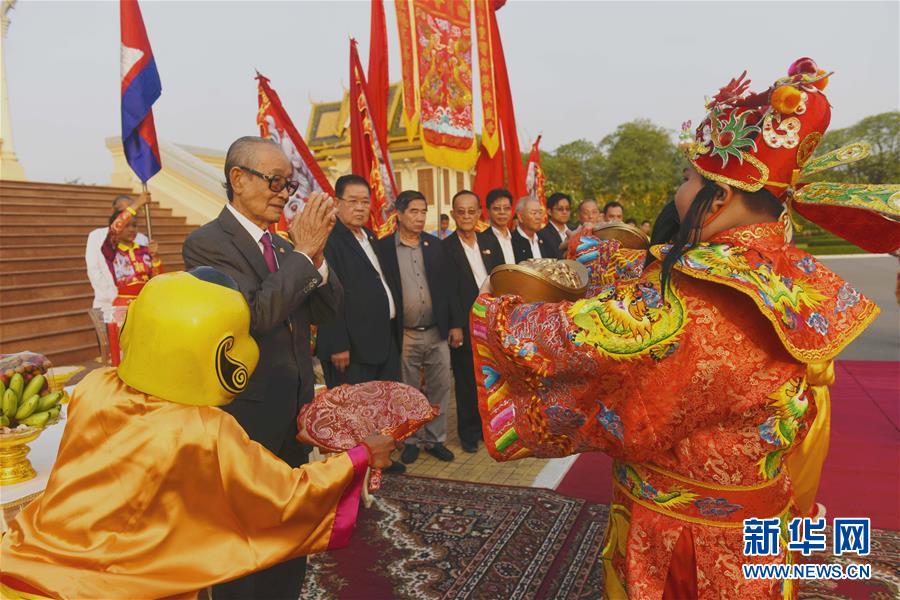 2月4日,在柬埔寨金边,柬华理事总会组织的龙狮团到金边王宫拜年,向柬埔寨副首相兼王宫事务大臣贡桑奥(左一)送上新春祝福。 新华社记者毛鹏飞摄