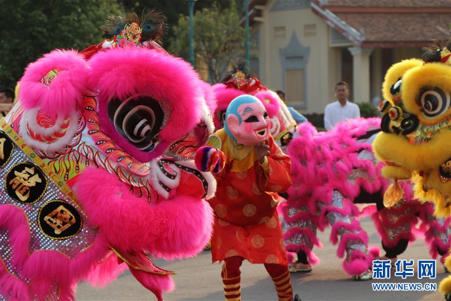 2月4日,在柬埔寨金边,柬华理事总会组织的龙狮团到金边王宫拜年时进行表演。新华社发(高炳南摄)