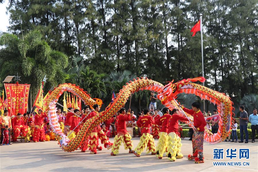 2月4日,在柬埔寨金边,柬华理事总会组织的龙狮团在中国驻柬埔寨大使馆表演。 新华社发(高炳南摄)