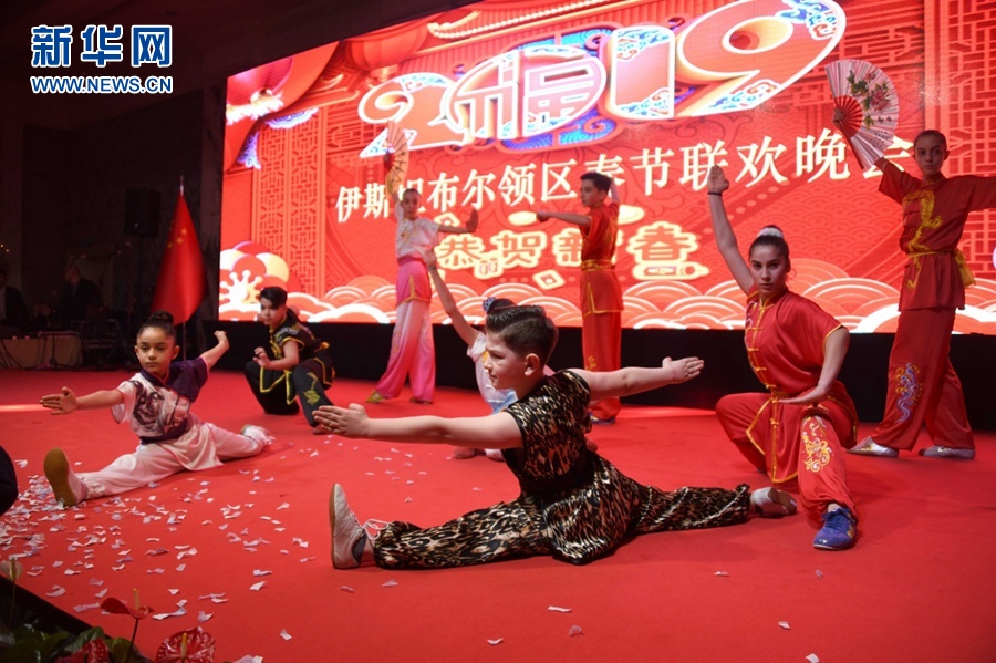 1月31日,在土耳其伊斯坦布尔,武术爱好者在联欢晚会上表演。当日,中国驻伊斯坦布尔领事馆举办伊斯坦布尔领区春节联欢晚会,庆贺农历新年。 新华社记者 徐速绘 摄