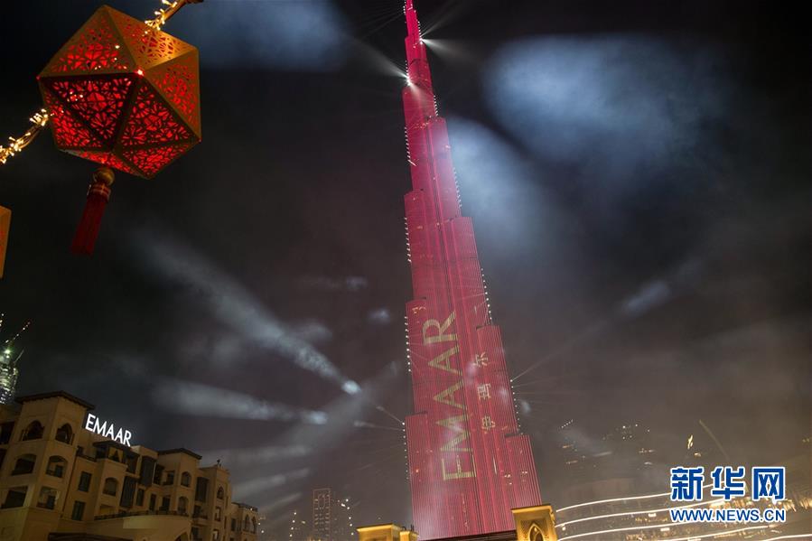 2月4日,在阿联酋迪拜,世界第一高楼哈利法塔上演春节灯光秀,迎接中国新年。新华社发(马哈茂德·哈立德摄)