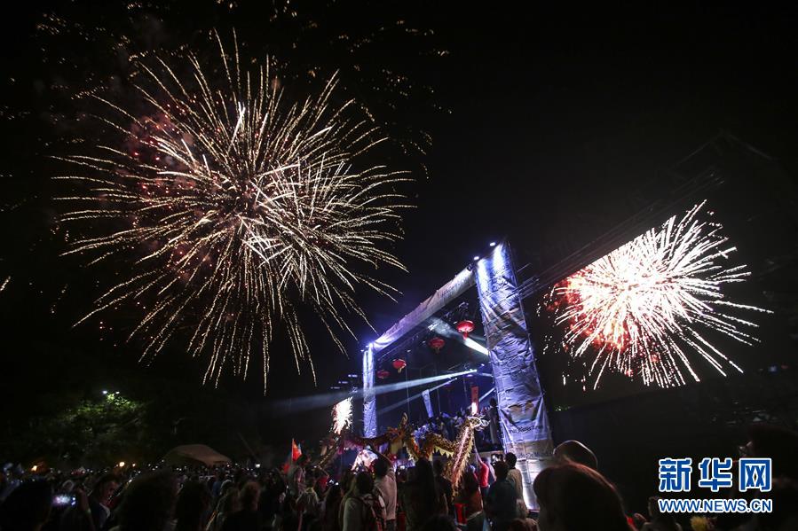 2月3日,在阿根廷布宜诺斯艾利斯,观众在“欢乐春节 魅力阿根廷”猪年春节庙会上观看焰火表演。 新华社发(马丁·萨巴拉摄)