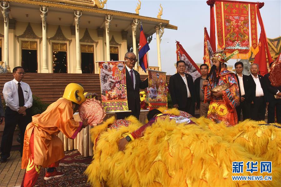 2月4日,在柬埔寨金边,柬华理事总会组织的龙狮团到金边王宫拜年,向柬埔寨副首相兼王宫事务大臣贡桑奥(中)送上新年祝福。 新华社记者毛鹏飞摄