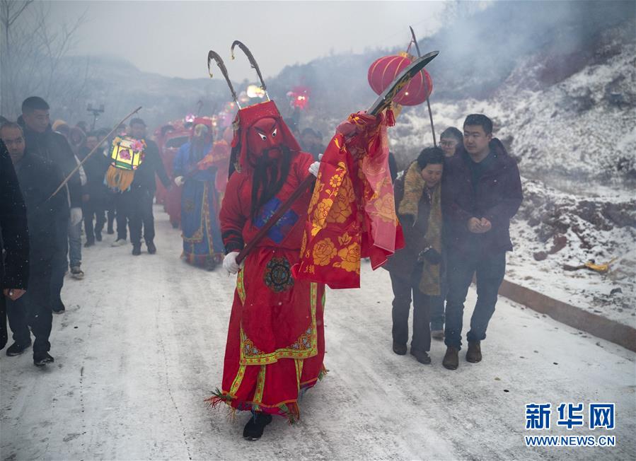 2月17日,在甘肃省陇南市武都区鱼龙镇卯家庄村,高山戏演员在村内巡游表演。 临近元宵节,发源于甘肃省陇南市武都区鱼龙镇的高山戏在当地山村中开演。武都高山戏至今已有七百余年的历史,2008年入选第二批国家级非物质文化遗产名录。 新华社记者 才扬 摄