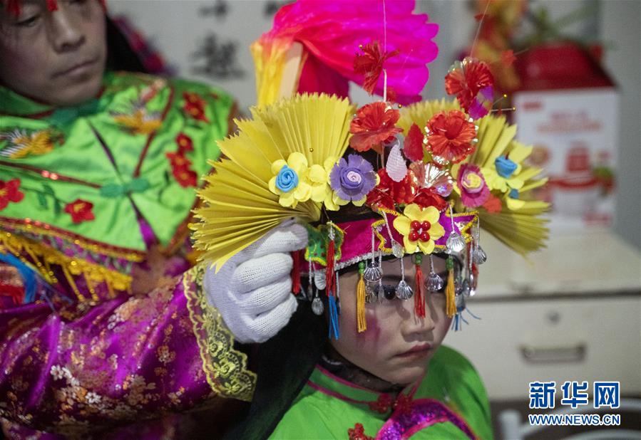 2月17日,在甘肃省陇南市武都区鱼龙镇卯家庄村,一名高山戏演员在穿戴演出服饰。 临近元宵节,发源于甘肃省陇南市武都区鱼龙镇的高山戏在当地山村中开演。武都高山戏至今已有七百余年的历史,2008年入选第二批国家级非物质文化遗产名录。 新华社记者 才扬 摄