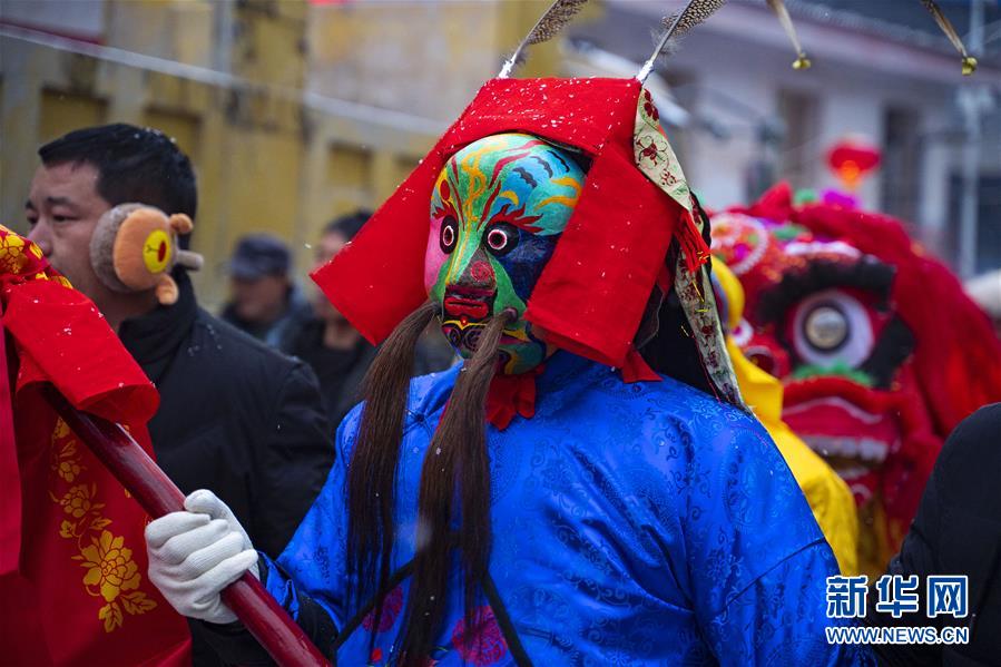 2月17日,在甘肃省陇南市武都区鱼龙镇卯家庄村,高山戏演员在村内巡游表演。 临近元宵节,发源于甘肃省陇南市武都区鱼龙镇的高山戏在当地山村中开演。武都高山戏至今已有七百余年的历史,2008年入选第二批国家级非物质文化遗产名录。 新华社记者 才扬 摄
